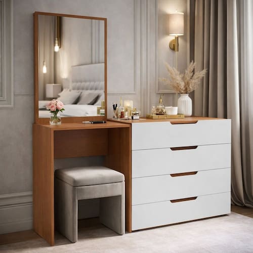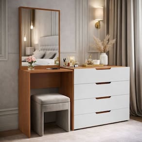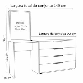 A Cômoda Penteadeira Madrid 4 Gavetas da Politorno Móveis é a união perfeita entre elegância, funcionalidade e acabamento de alto padrão, ideal para valorizar o ambiente com praticidade e sofisticação. Com 160 cm de altura, 149 cm de largura e 46 cm de profundidade, oferece excelente espaço para organização e uso diário. Possui puxadores embutidos com formato arredondado, que garantem um design moderno, seguro e confortável ao toque. O espelho incluso traz praticidade e amplia visualmente o espaço, tornando a rotina muito mais funcional. As corrediças telescópicas proporcionam abertura suave, total e silenciosa das gavetas, assegurando conforto e durabilidade. O acabamento em pintura UV confere maior resistência, proteção contra desgaste e fácil limpeza, mantendo o móvel sempre bonito. Acabamento da Gaveta: Pintura UV Acompanha Banqueta: Não Altura do Espelho: 71 cm Ambiente Principal: Quarto codigo_ean: 7900288323552 Complexidade da Montagem: Média: pode ser montado por mais de uma pessoa e/ou necessite de maior conhecimento para montagem Cor: Branco/Freijó Cor do Produto: Branco/Freijó Cor Interna: Freijó Escala de Brilho: Semi-Fosco Escala de Brilho da Gaveta: Semi-Fosco Espessura do Espelho: 3 mm Fita Integrada: Sim Formato do Espelho: Retangular Gaveta com Chave: Não Itens Inclusos: 1 Cômoda, Kit Ferragens, Manual de Montagem e Termo de Garantia Largura do Espelho: 53 cm Linha ou Coleção: Madrid Manual de Montagem e Instalação: https://product-hub-prd.madeiramadeira.com.br/186894688/documents/47187802-e16c-49b5-9dc1-74c0b46501993349317622417677240723685.pdf Marca: Politorno Material da Gaveta: MDP Material Principal: MDP Necessita Montagem: Sim Origem do Produto: Nacional Peso: 37,42 kg Peso Máximo por Gaveta: 5 kg Possui iluminação: Não Possui Pés: Não Possui Porta Objetos: Não Possui Portas: Não Possui Prateleiras: Não Quantidade de Espelho: 01 Recomendações de Uso, Manutenção e Limpeza: Utilize um pano macio umedecido com água e sabão neutro, seguido de pano seco. Não utilize produtos químicos ou abrasivos para limpeza, pois estes danificam o revestimento do móvel. Sapatas Niveladoras: Não Sistema de Montagem: Cavilha, Parafuso, Minifix e prego. Suporta Até (kg): 30 kg Tipo de Corrediça da Gaveta: Metálica Telescópica Tipo de Fixação do Espelho: Fita Dupla Face Tipo de Puxador da Gaveta: Embutido Marca: Não Informado