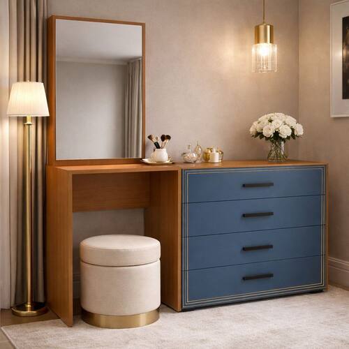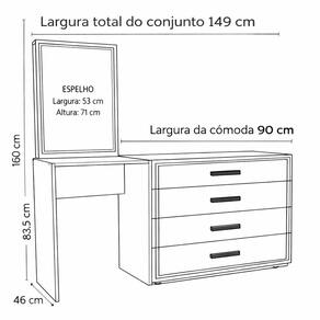 A Cômoda Penteadeira Valência 4 Gavetas da Politorno Móveis combina sofisticação, funcionalidade e design diferenciado, sendo perfeita para valorizar o ambiente com elegância. Com 160 cm de altura, 149 cm de largura e 46 cm de profundidade, oferece excelente espaço para organização no dia a dia. Possui puxadores em MDF que reforçam a robustez e o visual contemporâneo, além de usinagem nas gavetas, um detalhe exclusivo que agrega charme e identidade ao móvel. O espelho incluso traz praticidade e amplia visualmente o espaço, enquanto as corrediças telescópicas garantem abertura total, suave e silenciosa das gavetas. O acabamento em pintura UV assegura alta durabilidade, resistência e fácil limpeza, mantendo o móvel sempre bonito. Uma peça elegante, funcional e com a qualidade Politorno. Acabamento da Gaveta: Pintura UV Acompanha Banqueta: Não Altura do Espelho: 71 cm Ambiente Principal: Quarto codigo_ean: 7900288323651 Complexidade da Montagem: Média: pode ser montado por mais de uma pessoa e/ou necessite de maior conhecimento para montagem Cor: Azul/Freijó Cor do Produto: Azul/Freijó Cor Interna: Freijó Escala de Brilho: Semi-Fosco Escala de Brilho da Gaveta: Semi-Fosco Espessura do Espelho: 3 mm Fita Integrada: Sim Formato do Espelho: Retangular Gaveta com Chave: Não Itens Inclusos: 1 Cômoda, Kit Ferragens, Manual de Montagem e Termo de Garantia Largura do Espelho: 53 cm Linha ou Coleção: Valência Manual de Montagem e Instalação: https://product-hub-prd.madeiramadeira.com.br/313621308/documents/a80cd184-0d78-44cc-aff0-3e3c42796b673349529622417677944047388.pdf Marca: Politorno Material da Gaveta: MDP Material do Puxador da Gaveta: MDP Material Principal: MDP Montagem Flex: Sim Necessita Montagem: Sim Origem do Produto: Nacional Peso: 40,96 kg Peso Máximo por Gaveta: 5 kg Possui iluminação: Não Possui Pés: Não Possui Porta Objetos: Não Possui Portas: Não Possui Prateleiras: Não Quantidade de Espelho: 01 Recomendações de Uso, Manutenção e Limpeza: Utilize um pano macio umedecido com água e sabão neutro, seguido de pano seco. Não utilize produtos químicos ou abrasivos para limpeza, pois estes danificam o revestimento do móvel. Sapatas Niveladoras: Não Sistema de Montagem: Cavilha, Parafuso, Minifix e prego. Suporta Até (kg): 30 kg Tipo de Corrediça da Gaveta: Metálica Telescópica Tipo de Fixação do Espelho: Fita Dupla Face Tipo de Puxador da Gaveta: Externo Marca: Não Informado