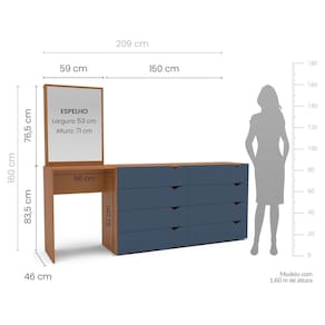 A Cômoda 8 Gavetas Porto da Politorno Móveis é a escolha perfeita para quem precisa de ainda mais espaço sem abrir mão do design elegante e contemporâneo. Com visual clean e acabamento em pintura UV azul e freijó semi fosco, essa peça da Linha Porto traz sofisticação e praticidade ao ambiente, sendo ideal para quartos que exigem organização com estilo. Com 209 cm de largura, 160 cm de altura e 46 cm de profundidade, ela oferece excelente capacidade de armazenamento por meio de 8 gavetas espaçosas, ideais para acomodar roupas, acessórios, documentos e outros itens do dia a dia com total funcionalidade. Fabricada em MDP de alta qualidade, é resistente, durável e de fácil limpeza, tornando-se uma solução completa para manter seu espaço sempre organizado, bonito e harmonioso. Produto Montado: Sim Acabamento da Gaveta: Pintura UV Altura do Espelho: 71 cm Ambiente Principal: Quarto codigo_ean: 7900288188533 Complexidade da Montagem: Baixa: pode ser montado por uma pessoa sozinha Cor: Azul/Freijó Cor do Produto: Azul/Freijó Cor Interna: Freijó Escala de Brilho: Semi-Fosco Escala de Brilho da Gaveta: Semi-Fosco Espessura do Espelho: 3 mm Fita Integrada: Sim Formato do Espelho: Retangular Gaveta com Chave: Não Itens Inclusos: 1 Cômoda, Kit Ferragens, Manual de Montagem e Termo de Garantia Largura do Espelho: 53 cm Linha ou Coleção: Porto Manual de Montagem e Instalação: https://product-hub-prd.madeiramadeira.com.br/952956784/documents/fbd56b81-2686-4692-9374-a28cb36f70573049904622417515696293498.pdf Marca: Politorno Material da Gaveta: MDP Material do Fundo: MDP Material Principal: MDP Necessita Montagem: Sim Origem do Produto: Nacional Peso: 62 kg Peso Máximo por Gaveta: 5 kg Possui Espelho: Sim Possui Nichos: Não Possui Pés: Não Possui Portas: Não Possui Prateleiras: Não Quantidade de Espelho: 01 Quantidade de Gavetas: 08 Gavetas Recomendações de Uso, Manutenção e Limpeza: Utilize um pano macio umedecido com água e sabão neutro, seguido de pano seco. Não utilize produtos químicos ou abrasivos para limpeza, pois estes danificam o revestimento do móvel. Sapatas Niveladoras: Não Sistema de Montagem: Cavilha, Parafuso, Minifix e prego. Suporta Até (kg): 30 kg Tipo de Corrediça da Gaveta: Metálica Telescópica Tipo de Fixação do Espelho: Fita Dupla Face Tipo de Puxador da Gaveta: Embutido Marca: Não Informado