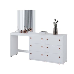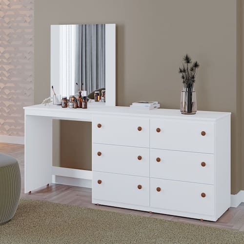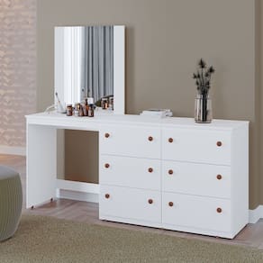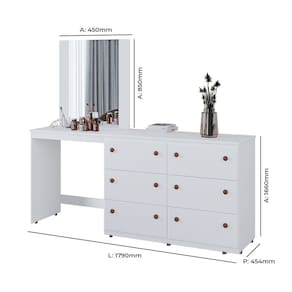 Conheça a Comoda Penteadeira Marília, o epítome do glamour e praticidade! Fabricada em 100% MDF de alta qualidade, garante durabilidade e sofisticação. Equipada com seis gavetas e um nicho, oferece amplo espaço de armazenamento para seus itens de beleza. Seu espelho adiciona um toque de elegância e funcionalidade ao espaço. Ideal para criar um cantinho de beleza digno de uma diva. Adquira agora e eleve sua rotina de cuidados pessoais!