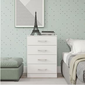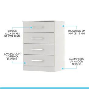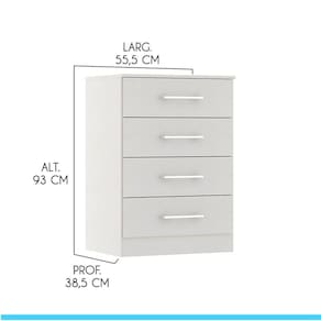 Cômoda Pequena Com 4 Gavetas 55x93cm Mdp Branco Menu Móveis Branco Voce merece o melhor quando se trata de moveis para sua casa e a escolha certa para atender todas as suas necessidades. Com um design atual, une versatilidade, conforto e beleza. Com quatro gavetas, voce tera muito espaco para manter tudo organizado e ao alcance das maos. Produzida com materiais de excelente qualidade, garantindo a sua resistencia ao desgaste diario e mantendo sua beleza e funcionalidade por muito tempo. O melhor em moveis no design atual aliando conforto, qualidade e otimos precos, so na Menu Moveis! Caracteristicas: Referencia: 2007 Material: MDP de 12 mm Acabamento: Pintura UV na cor Branco Gavetas: 04 Gavetas com Corredica Plastica Puxadores Alca em ABS na cor Cromado