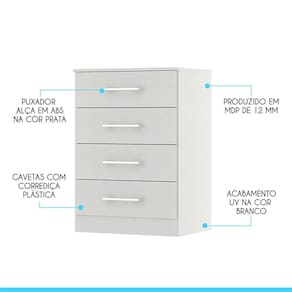 Voce merece o melhor quando se trata de moveis para sua casa e a escolha certa para atender todas as suas necessidades. Com um design atual, une versatilidade, conforto e beleza. Com quatro gavetas, voce tera muito espaco para manter tudo organizado e ao alcance das maos. Produzida com materiais de excelente qualidade, garantindo a sua resistencia ao desgaste diario e mantendo sua beleza e funcionalidade por muito tempo. O melhor em moveis no design atual aliando conforto, qualidade e otimos precos, so na Menu Moveis!