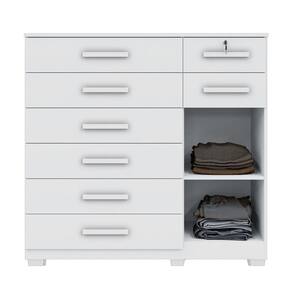 Cômoda Pernambuco 8 Gavetas 1 Porta Com Sapateira - Benetil Branco A Comoda Pernambuco complementa seu quarto com charme e sofisticacao, combinando praticidade e beleza. Com oito gavetas espacosas, sendo uma com chave para maior seguranca, oferece organizacao e seguranca para seus itens pessoais. Suas corredicas telescopicas proporcionam suavidade e resistencia no uso diario. Conta ainda com uma porta e prateleira interna, formando uma sapateira bem estruturada. Fabricada em chapa de 15 mm, garante durabilidade e robustez superiores. Com a tecnologia MDP Perfect, alia sustentabilidade e inovacao, proporcionando longa vida util e facil manutencao. A pintura UV de alta resistencia e facil de limpar e ecologicamente correta, feita com madeira de reflorestamento para uma escolha mais sustentavel. Caracteristicas: Material Principal: Mdp Espessura Da Chapa: 15 Mm Escala De Brilho: Semi Brilho Acabamento: Pintura UV Sistema De Montagem: Parafuso, Cavilha E Cantoneiras Metalicas Quantidade de Gavetas: 08 Quantidade de Portas: 01