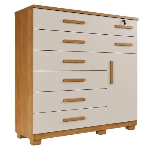 Cômoda Pernambuco 8 Gavetas 1 Porta Com Sapateira - Benetil Cinamomo Off A Comoda Pernambuco complementa seu quarto com charme e sofisticacao, combinando praticidade e beleza. Com oito gavetas espacosas, sendo uma com chave para maior seguranca, oferece organizacao e seguranca para seus itens pessoais. Suas corredicas telescopicas proporcionam suavidade e resistencia no uso diario. Conta ainda com uma porta e prateleira interna, formando uma sapateira bem estruturada. Fabricada em chapa de 15 mm, garante durabilidade e robustez superiores. Com a tecnologia MDP Perfect, alia sustentabilidade e inovacao, proporcionando longa vida util e facil manutencao. A pintura UV de alta resistencia e facil de limpar e ecologicamente correta, feita com madeira de reflorestamento para uma escolha mais sustentavel. Caracteristicas: Material Principal: Mdp Espessura Da Chapa: 15 Mm Escala De Brilho: Semi Brilho Acabamento: Pintura UV Sistema De Montagem: Parafuso, Cavilha E Cantoneiras Metalicas Quantidade de Gavetas: 08 Quantidade de Portas: 01
