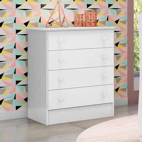 Puxadores duplos no formato de estrela.Características: MDP de 12 e 15 mm; Pintura UV; Bordas em perfil PVC; 4 gavetas; Corrediças metálicas; Puxadores duplos no formato de estrela.