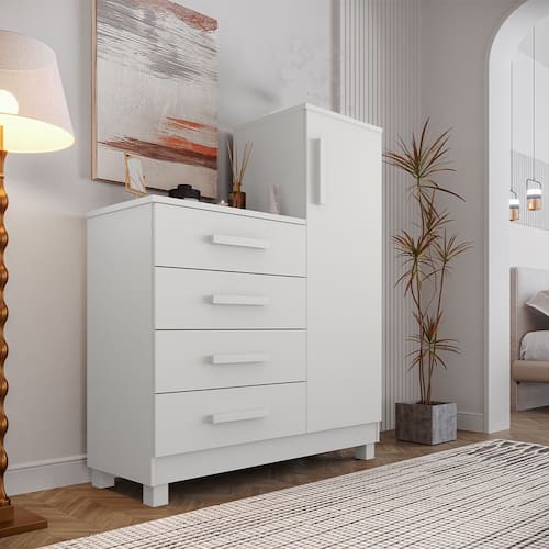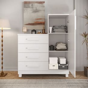 Cômoda Versátil com 4 Gavetas e Multiuso: Praticidade, Estilo e Muito Espaço! Deixe seu ambiente mais organizado e bonito com essa cômoda funcional e moderna! Produzida em MDP de alta qualidade e com acabamento em pintura UV, ela oferece resistência e um visual sofisticado para qualquer espaço da sua casa. Com 4 gavetas espaçosas com corrediças telescópicas, você tem muito mais praticidade e suavidade no dia a dia. Além disso, conta com um compartimento multiuso que pode ser utilizado como sapateira ou armário, ideal para quem busca versatilidade. Os puxadores e pés em PVC complementam o design com elegância e durabilidade, tornando este móvel uma excelente escolha para quartos ou salas compactas. A escolha certa para quem quer unir organização, estilo e funcionalidade em um só móvel.