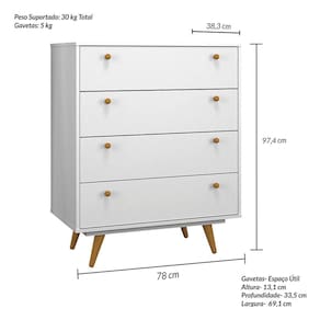 - Tipo do Móvel: Cômoda - Peso Máximo Suportado: 30 - Medida do Produto Montado (LXCXA): 38,3cmX78cmX97,4cm - Garantia: 3 Meses - Volumes: 1 - Recomendações de manutenção: Pano úmido. Não aplicar lustra móveis. - Tipo de Pés: Pé Palito - Quantidade de Pés: 4 - Tipo de Gaveta: Com corrediça metálica - Quantidade de Gaveta: 4 - Produto Necessita de Montagem?: Sim - Peso do Produto Montado: 32 - Material da Estrutura: Mdp e Mdf - Escala de Brilho: Acetinado - Acabamento: Pintura UV