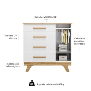 Características: Estrutura em MDF Corrediça telescópica Cabideiro metálico Puxadores em MDF