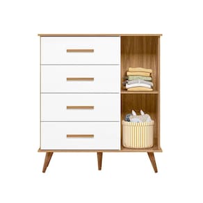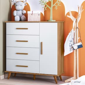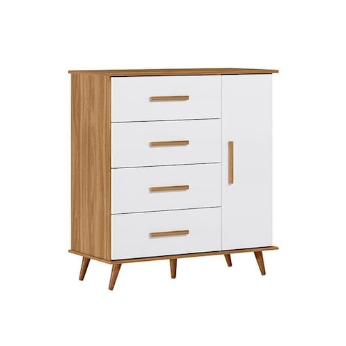 Produzida em MDP/MDF bio-sustentável de 15 mm, sua pintura acetinada é feita diretamente na madeira tratada, proporcionando assim um acabamento melhor ao móvel. Possui 1 porta e 4 gavetas com corrediças metálicas.