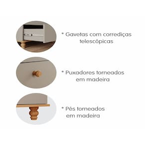 Seguindo o estilo lúdico, essa cômoda é perfeita para quem precisa de bastante espaço para organizar o enxoval dos pequenos.Possui nicho superior para organizar objetos de uso diário e 03 gavetas grandes com corrediças telescópicas que proporcionam deslizamento suave, maior abertura e melhor acesso às roupas. Possui também 01 porta de abrir com prateleira interna e 01 cabideiro para você montar de acordo com sua necessidade. Os puxadores e pés são torneados em madeira maciça e conferem um charme especial ao produto.O tampo possui bordas arredondadas que recebem pintura em laca com tinta atóxica e as peças retas recebem pintura UV também com tinta e verniz atóxicos.Fabricada com matéria-prima 100% MDF, um material ecologicamente correto e de ótima durabilidade e resistência.