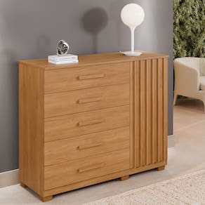 Comoda Ripada 5 Gavetas 1 Porta com Pes Paris Benetil. A Comoda Paris une sofisticacao e versatilidade em um unico movel. Produzida em chapa de 15 mm, oferece alta durabilidade. Seu design moderno conta com 1 porta ripada, 2 prateleiras internas e 5 gavetas amplas, ideais para manter tudo organizado. As corredicas telescopicas garantem um deslizamento suave e resistente. Acompanha pes que proporcionam mais estabilidade e puxadores com acabamento elegante.