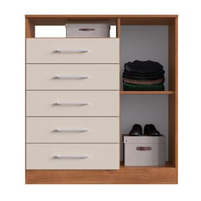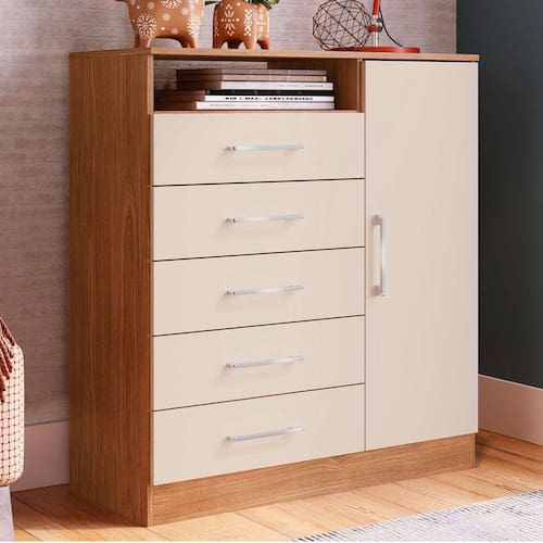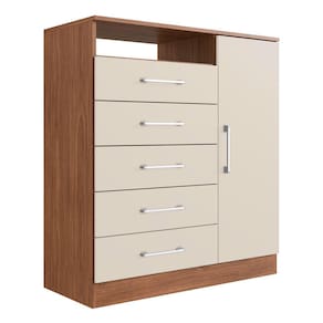 O(a) Cômoda Rubi 1 Porta 5 Gavetas Freijó/Off White - Irm Móveis é produzido em MDP na escala de brilho Fosco, e possui um grau de dificuldade de montagem: Médio.