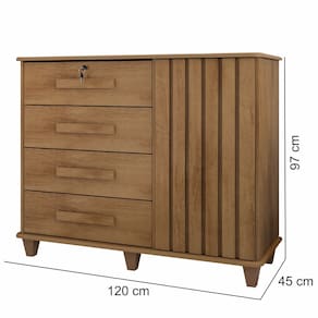 Descrição: A Cômoda Grécia ripada é essencial para quem quer um design moderno no ambiente, sem deixar a praticidade do dia a dia de lado! Ela conta com 4 gavetas espaçosas para manter melhor a organização, sendo uma com tranca e chave, duas prateleiras internas que auxiliam na hora de guardar seus sapatos e outros pertences. Além de possuir a opção de detalhe ripado na hora da montagem e pés resistentes que não agridem o chão e facilitam na hora da limpeza.