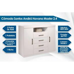 CARACTERÍSTICAS DE MÓVEIS Tipo de Estrutura do Móvel - 100% MDP Tipo de Pintura - UV (Ultravioleta) Tipo de Acabamento da Pintura - Pintura Alto Brilho ou Fosca Tipo de puxador - ABS / PVC Quantidade de Prateleiras - 1 Prateleira Quantidade de Gavetas - 4 Gavetas Diferenciais da Gaveta - Corrediças Metálicas Quantidade de Portas - 2 Portas de Abrir Quantidade de nichos - 1 Nicho Garantia - 3 Meses