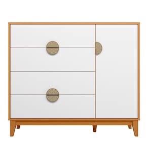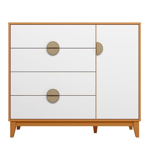 • Informações Adicionais: Puxadores de ABS com acabamento metalizado dourado e aplique que remete a palha indiana
