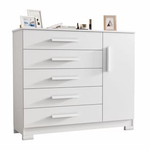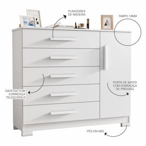 A Cômoda Sapateira 5 Gavetas Pietra é a solução perfeita para você! Ela combina qualidade, funcionalidade e elegância para transformar seu quarto em um ambiente moderno e organizado. Gavetas que deslizam com corrediças telescópicas garantem uma abertura suave e maior capacidade de carga. Guarde suas roupas, acessórios e objetos pessoais de forma prática e sempre acessível. O tampo de 1,8 cm oferece estabilidade extra, ideal para apoiar itens de decoração ou o que você precisar. Seu design clean harmoniza com diversos estilos de decoração. Produto Montado: Sim Acabamento da Gaveta: Pintura UV Acabamento da Porta: Pintura UV Acabamento da Prateleira: Pintura UV Ambiente Principal: Quarto codigo_ean: 7900288196606 Complexidade da Montagem: Baixa: pode ser montado por uma pessoa sozinha Cor: Branco Cor do Produto: Branco Escala de Brilho: Fosco Escala de Brilho da Gaveta: Fosco Escala de Brilho da Porta: Fosco Escala de Brilho da Prateleira: Fosco Gaveta com Chave: Não Itens Inclusos: 1 Cômoda, Kit Ferragens e Manual de Montagem Linha ou Coleção: Pietra Manual de Montagem e Instalação: https://product-hub-prd.madeiramadeira.com.br/434715093/documents/653411c0-c543-4461-904c-ed42b2d24f1b307863864517527771792458.pdf Marca: JCM Móveis Material da Gaveta: MDP Material da Porta: MDP Material da Prateleira: MDP Material do Fundo: HDF Material do Puxador da Gaveta: MDP Material do Puxador da Porta: MDF Material dos Pés: PVC Material Principal: MDP Necessita Montagem: Sim Origem do Produto: Nacional Peso: 53,55 kg Peso Máximo por Gaveta: 8 kg Peso Máximo por Prateleira: 8 kg Possui Espelho: Não Possui Nichos: Não Possui Pés: 04 Possui Portas: Sim Possui Prateleiras: Sim Possui Rodízio: Não Quantidade de Gavetas: 05 Gavetas Quantidade de Prateleiras: 01 Prateleira Recomendações de Uso, Manutenção e Limpeza: Pano Levemente Úmido Sapatas Niveladoras: Não Sistema de Montagem: Parafusos e Minifix Suporta Até (kg): 64 kg Tipo de Cômoda: Adulto Tipo de Corrediça da Gaveta: Metálica Telescópica Tipo de Dobradiça/Corrediça da Porta: Metálica Tipo de Porta: Bater Tipo de Puxador da Gaveta: Externo Tipo de Puxador da Porta: Externo