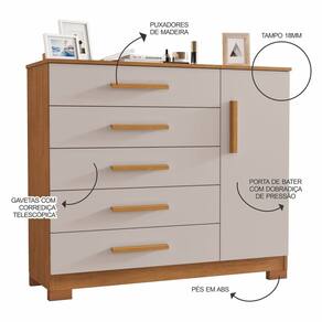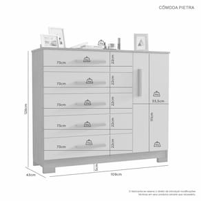 A Cômoda Sapateira 5 Gavetas Pietra é a solução perfeita para você! Ela combina qualidade, funcionalidade e elegância para transformar seu quarto em um ambiente moderno e organizado. Gavetas que deslizam com corrediças telescópicas garantem uma abertura suave e maior capacidade de carga. Guarde suas roupas, acessórios e objetos pessoais de forma prática e sempre acessível. O tampo de 1,8 cm oferece estabilidade extra, ideal para apoiar itens de decoração ou o que você precisar. Seu design clean harmoniza com diversos estilos de decoração. Produto Montado: Sim Acabamento da Gaveta: Pintura UV Acabamento da Porta: Pintura UV Acabamento da Prateleira: Pintura UV Ambiente Principal: Quarto codigo_ean: 7900288196590 Complexidade da Montagem: Baixa: pode ser montado por uma pessoa sozinha Cor: Cinamomo / Off White Cor do Produto: Cinamomo / Off White Escala de Brilho: Fosco Escala de Brilho da Gaveta: Fosco Escala de Brilho da Porta: Fosco Escala de Brilho da Prateleira: Fosco Gaveta com Chave: Não Itens Inclusos: 1 Cômoda, Kit Ferragens e Manual de Montagem Linha ou Coleção: Pietra Manual de Montagem e Instalação: https://product-hub-prd.madeiramadeira.com.br/881904252/documents/36ad64e1-9b0c-42c9-b18e-ea56b2a75396307863864517527771792458.pdf Marca: JCM Móveis Material da Gaveta: MDP Material da Porta: MDP Material da Prateleira: MDP Material do Fundo: HDF Material do Puxador da Gaveta: MDP Material do Puxador da Porta: MDF Material dos Pés: PVC Material Principal: MDP Necessita Montagem: Sim Origem do Produto: Nacional Peso: 53,55 kg Peso Máximo por Gaveta: 8 kg Peso Máximo por Prateleira: 8 kg Possui Espelho: Não Possui Nichos: Não Possui Pés: 04 Possui Portas: Sim Possui Prateleiras: Sim Possui Rodízio: Não Quantidade de Gavetas: 05 Gavetas Quantidade de Prateleiras: 01 Prateleira Recomendações de Uso, Manutenção e Limpeza: Pano Levemente Úmido Sapatas Niveladoras: Não Sistema de Montagem: Parafusos e Minifix Suporta Até (kg): 64 kg Tipo de Cômoda: Adulto Tipo de Corrediça da Gaveta: Metálica Telescópica Tipo de Dobradiça/Corrediça da Porta: Metálica Tipo de Porta: Bater Tipo de Puxador da Gaveta: Externo Tipo de Puxador da Porta: Externo