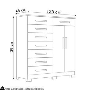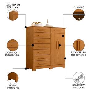 Com design moderno e amplo espaço, essa cômoda para quarto conta com 8 gavetas espaçosas, excelentes para dispor roupas que não amassam, como também as peças de cama, mesa e banho. Além disso, a parte interna da porta, pode ser aproveitada como sapateira e, ainda, serve para dispor algumas peças de cabide, já que possui cabideiro de madeira. Já os pés são excelentes aliados contra a umidade, bem como facilitam a limpeza e garantem estabilidade ao produto. Para completar, você pode dar aquele toque de charme ao dispor alguns itens decorativos sobre o tampo e deixar o quarto elegante e aconchegante.