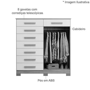 Característica da Cômoda Sapateira: - Estrutura em MDP; - Acabamento de pintura em UV; - 2 portas de bater com dobradiças metálicas; - 8 Gavetas com corrediças telescópicas; - Puxadores em MDF revestidos; - Cabideiro; - Não acompanha itens de decoração ou quaisquer objetos fora o móvel na imagem; - Imagens interna meramente ilustrativa para ver a divisão do produto;