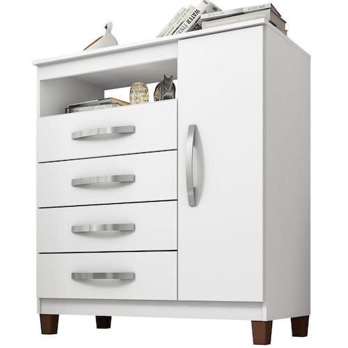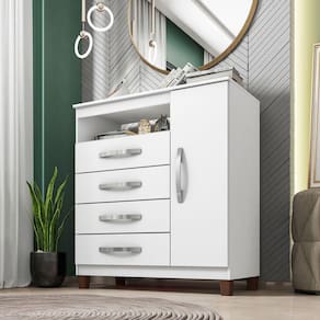 Características Gerais do Produto: - Altura: 92,20 cm - Gavetas: 4 Gavetas - Ideal para: Quarto - Informações Adicionais: - Não nos responsabilizamos pela montagem dos produtos. Todos os produtos acompanham acessórios para que sejam montados. - Não nos responsabilizamos, no ato da entrega, por subir escadas/elevadores ou transporte por guincho em apartamentos. Eventuais despesas são de responsabilidade do comprador; - Confira as dimensões deste produto e certifique-se de que passará normalmente por supostos elevadores, portas, escadas e/ou corredores de sua residência; - Não aceitamos devolução de produtos com caixas violadas ou materiais danificados, confira a quantidade de volumes e se o que está sendo entregue corresponde com a mercadoria adquirida, não aceitamos devolução após o prazo de arrependimento de 7 dias corridos. - Largura: 83,70 cm - Material: MDP - Pintura: Pintura Uv - Portas: 1 Porta - Profundidade: 40 cm - Tipo de Porta: Porta de Bater - Informações Adicionais: Prateleira recomendado 5kg, Gavetas recomendado 3 kg, Em seu tampo recomendado 8 kg.