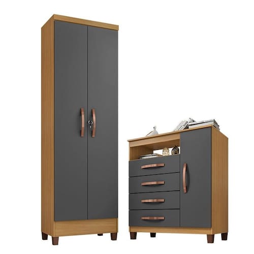 Cômoda Sapateira Cannes e Armário Multiuso Egito Carvalho Americano Grafite – Incorplac