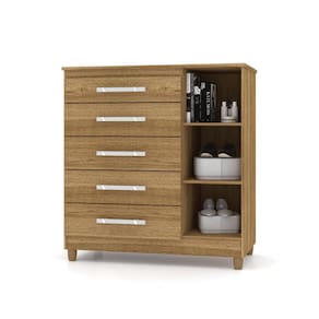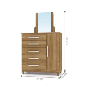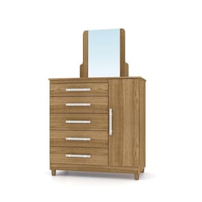 Produzido em MDP, 1 Porta, 5 Gavetas com corrediças metálicas. Pés de madeira opcional na montagem, Moldura com espelho opcional, puxadores metalizados com design moderno