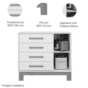 Precisando de espaço para guardar os pertences da sua criança? A cômoda sapateira te oferece amplo espaço de armazenamento com suas 4 gavetas e porta sapateira! Além de ser feita com materiais de alta qualidade como estrutura em MDP e pintura UV atóxica! Venha conferir esse e muitos outros produtos incríveis aqui na Casa Chick!