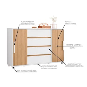 A Cômoda Sapateira para Quarto 150cm 2 Portas 4 Gavetas Flex Eve A02 Branco Fosco/Nature, da Mpozenato, é a solução de armazenamento perfeita que combina funcionalidade e estilo em uma peça impressionante!