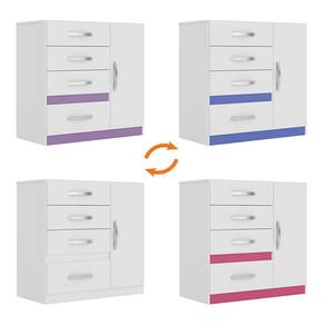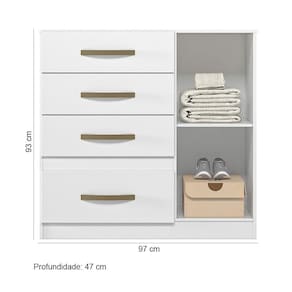 Características Estrutura em MDP de 15mm. Pintura em acabamento UV. 01 Porta articulada com dobradiças metálicas. 04 Gavetas externas com corrediças metálicas. Puxadores na cor bronze. Prateleira interna com amplo espaço.