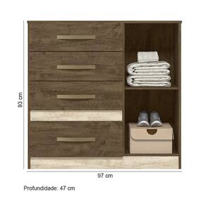 Características Estrutura em MDP de 15mm. Pintura em acabamento UV. 01 Porta articulada com dobradiças metálicas. 04 Gavetas externas com corrediças metálicas. Puxadores na cor bronze. Prateleira interna com amplo espaço.