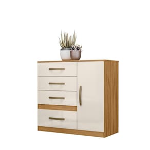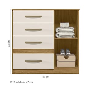 Características Estrutura em MDP de 15mm. Pintura em acabamento UV. 01 Porta articulada com dobradiças metálicas. 04 Gavetas externas com corrediças metálicas. Puxadores na cor bronze. Prateleira interna com amplo espaço.