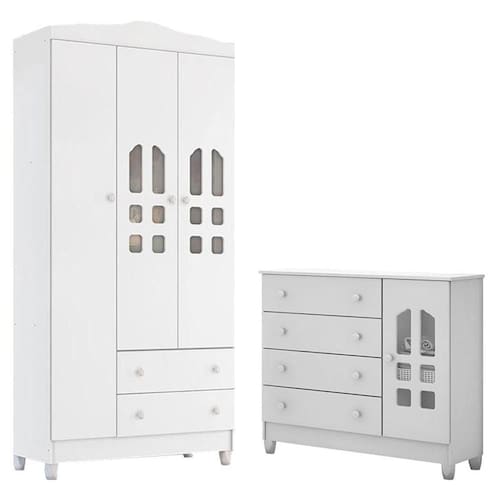 Cômoda Selena e Guarda Roupa Infantil New Selena 3 Portas Branco Brilho – Carolina