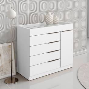 Produzida em MDP resistente com tampo de vidro elegante, conta com 5 gavetas espaçosas de corrediças telescópicas, sendo uma com divisória móvel, além de 1 porta para ampliar a organização.