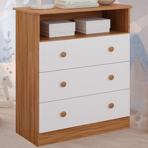 A Cômoda Smim da Móveis Peroba é ideal para organização das roupinhas do seu bebê. Muito prática com 3 Gavetas e 1 nicho. Feita com material 100% MDF. Possui o tampo com Bordas em Perfil PVC proporcionando um acabamento lindo e um cuidado extra para você e seu bebê.