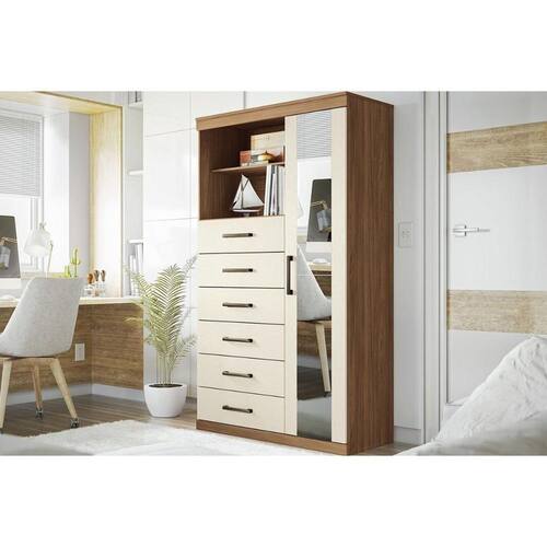 Cômoda de Quarto Marabá 1.6 c/ 1 Porta 2 Nichos e 6 Gavetas c/ Espelho jatoba/Areia - Santos Andirá