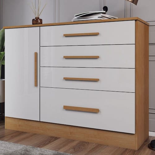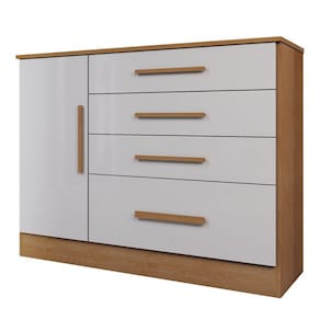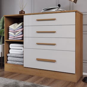 O(a) Cômoda Summit 1 Porta 4 Gavetas Cinamomo/Off White - Loja é produzido em MDP na escala de brilho Fosco e Semi-Brilho, e possui um grau de dificuldade de montagem: Médio.
