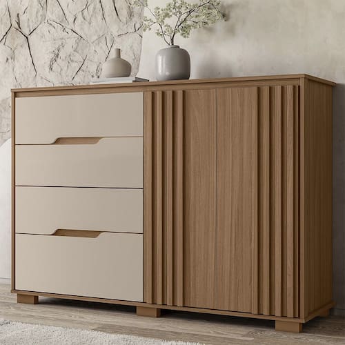 Características: Estrutura em MDP Acabamento em Pintura UV 04 Gavetas com corrediças telescópicas Dobradiças com Amortecedor Portas com detalhes ripados e puxadores usinados.