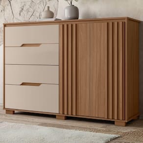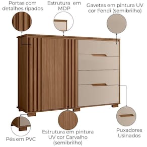 Cômoda Texas alia funcionalidade e design moderno para organizar seu ambiente com estilo. Estrutura em MDP (gavetas e tampo 15 mm / base e fundo 12 mm) com acabamento em pintura UV. Composta por 4 gavetas (sendo 1 gavetão) equipadas com corrediças metálicas, portas com detalhes ripado (baixo relevo) equipadas com dobradiças (35mm) com amortecedor, puxadores em cava e pés em PVC. Este produto será entregue em 02 volumes.