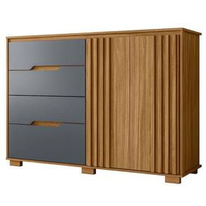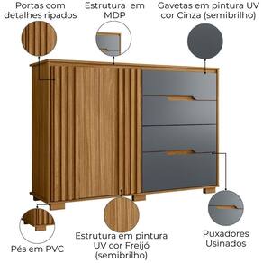 Cômoda Texas alia funcionalidade e design moderno para organizar seu ambiente com estilo. Estrutura em MDP (gavetas e tampo 15 mm / base e fundo 12 mm) com acabamento em pintura UV. Composta por 4 gavetas (sendo 1 gavetão) equipadas com corrediças metálicas, portas com detalhes ripado (baixo relevo) equipadas com dobradiças (35mm) com amortecedor, puxadores em cava e pés em PVC. Este produto será entregue em 02 volumes.