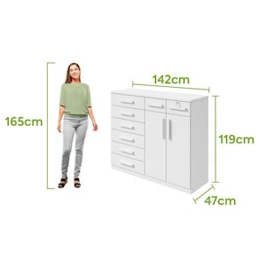 Produto em MDP; Pintura U.V. e acabamento em micro textura; Puxadores em MDF; 08 gavetas; Gaveta com chave; Gavetas com corrediças telescópicas; 02 portas com prateleiras internas; Tampo de 25mm; Fundo das gavetas e costas em HDF. Vantagens/Benefícios: Produzido com equipamentos de alta tecnologia; Produto avaliado e aprovado por um rigoroso controle de qualidade; Fácil montagem e manual de montagem simplificado; Design minimalista; Acabamento com toque aveludado; Gavetas ideais para acomodação das roupas em maiores quantidades; Gavetas grandes e espaçosas com corrediças telescópicas; Tampo de 25mm para maior resistência; Portas com puxador para melhor acesso às prateleiras internas; Prateleiras internas para sapatos.