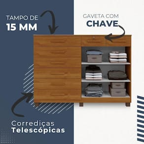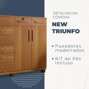 A Cômoda New Triunfo completa seu quarto com muito charme e beleza, possui 8 gavetas muito espaçosa sendo 1 com chave com corrediças telescópica que dá muita suavidade e resistência, ainda conta com 2 portas e 2 prateleiras.