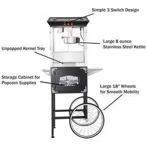 Componentes Incluídos Máquina de pipoca estilo antigo Great Northern Popcorn 6005 Lincoln Full Popper completa com carrinho e chaleira de 0,28 gramas