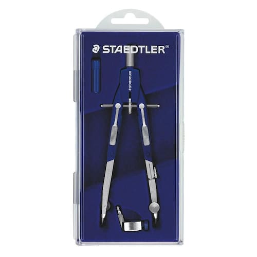 Compasso técnico de precisão com adaptador universal, roda central para ajuste rápido e estojo de plástico com tampa transparente articulada.