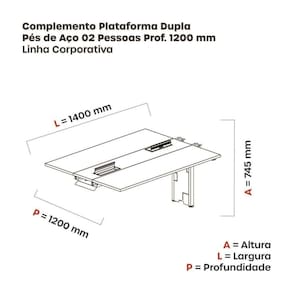 Complemento de mesa plataforma Para Coworking para 2 pessoas é uma ótima opção para quem busca um ambiente de trabalho moderno, funcional e confortável. Esse complemento de mesa possui uma estrutura de aço resistente e elegante, com espaço para a instalação de tomadas e conectores. Além disso, é permitindo adequar com mais plataformas para criar uma interação dinâmica e colaborativa, transfonando seu espaço de trabalho produtivo, criativo e agradável. Acompanha Manual de Instalação: Sim Ambiente Principal: Escritório Complexidade da Montagem: Baixa: pode ser montado por uma pessoa sozinha Cor: Cinza Cor da Base: Cinza Cor do Produto: Cinza Cor do Tampo: Cinza Cor Flex: Não Cor Interna: Cinza Dobrável: Não Escala de Brilho: Semi-Fosco Espessura do Tampo: 25 Formato: Retangular Itens Inclusos: 1 complemento Mesa plataforma Linha ou Coleção: Linha Corporativa Manual de Montagem e Instalação: https://cdn2.madeiramadeira.com.br/prd/pandin/1715728-Plataforma%20e%20Complemento%20Duplo%20P%C3%A9%20Painel.pdf Material da Estrutura: Aço Material do Tampo: MDP Material dos Pés: Polipropileno Material Principal: MDP Montagem Flex: Não Necessita Montagem: Sim Origem do Produto: Nacional Peso: 38.989 Possui Painel: Não Possui Passa Cabos: Não Possui Porta Objetos: Não Possui Portas: Não Possui Prateleiras: Não Possui suporte para CPU: Não Possui Suporte para Teclado: Não Possui Vidro: Não Recomendações de Uso, Manutenção e Limpeza: Utilize pano úmido com para limpeza Sapatas Niveladoras: Sim Sistema de Montagem: Parafuso Suporta Até (kg): 30