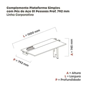 complemento de mesa corporativa adequado para ambientes de coworking. Esse complemento é projetado para ser utilizado em conjunto com outras mesas, permitindo aumentar o número de lugares disponíveis. Ela combina funcionalidade e estilo, proporcionando um espaço colaborativo confortável para trabalhar. Você pode adicionar essa mesa a outras unidades para criar um ambiente expansível conforme necessário. Produto Montado: Sim Acompanha Manual de Instalação: Sim Ambiente Principal: Escritório codigo_ean: 7909903512548 Complexidade da Montagem: Baixa: pode ser montado por uma pessoa sozinha Cor: Grafito/Preto Cor do Produto: Grafito/Preto Cor Flex: Não Cor Interna: Grafito/Preto Dobrável: Não Escala de Brilho: Semi-Fosco Espessura do Tampo: 25 mm Formato: Retangular Itens Inclusos: 1 complemento para plataforma Linha ou Coleção: Linha Corporativa Manual de Montagem e Instalação: https://product-hub-prd.madeiramadeira.com.br/883453/documents/42130ff9-0f60-4800-82e8-b2fa613e5729orma20Complemento20Simples.pdf Material da Estrutura: Aço Material do Tampo: MDP Material dos Pés: Polipropileno Material Principal: MDP Montagem Flex: Não Necessita Montagem: Sim Origem do Produto: Nacional Peso: 26,608 kg Possui Painel: Não Possui Passa Cabos: Não Possui Porta Objetos: Não Possui Portas: Não Possui Prateleiras: Não Possui suporte para CPU: Não Possui Suporte para Teclado: Não Possui Vidro: Não Recomendações de Uso, Manutenção e Limpeza: Utilize pano úmido com para limpeza Sapatas Niveladoras: Sim Sistema de Montagem: Parafuso Suporta Até (kg): 30 kg