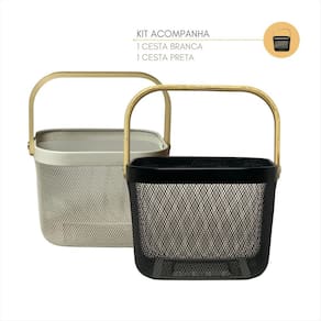 Cesta Organizador em Tela Metálica com Alça de Madeira - 24,5 x 24,5 x 18 cm Organize com charme, ventile com praticidade e decore com estilo A Cesta Organizadora em Tela Metálica com Alça de Madeira é o item perfeito para quem busca unir funcionalidade com design contemporâneo. Fabricada com estrutura metálica resistente e acabamento em pintura fosca, esta cesta proporciona um visual sofisticado e ao mesmo tempo discreto - ideal para compor diferentes ambientes da casa com harmonia e personalidade. características Técnicas: Material do corpo: Tela metálica em aço com pintura eletrostática acabamento fosco, durável e resistente à corrosão . material das alças: Madeira natural envernizada acabamento suave ao toque, com efeito visual quente e acolhedor . dimensões: 24,5 cm largura 24,5 cm profundidade 18 cm altura Vantagens e Aplicações: Organização multifuncional: ideal para armazenar toalhas de mão, rolos de papel, cosméticos, sabonetes, acessórios de cabelo, temperos, pacotes de alimentos, potes de mantimentos, talheres, panos de prato, entre outros. estilo versátil: combina perfeitamente com banheiros modernos, cozinhas abertas, lavanderias planejadas, home offices, espaços gourmet ou prateleiras decorativas. boa ventilação: a estrutura vazada de tela permite a circulação de ar, ideal para produtos que precisam respirar, como esponjas, alimentos secos ou tecidos. fácil de transportar: as alças de madeira anatômicas facilitam o manuseio mesmo quando a cesta está cheia. visual decorativo: o contraste entre o metal preto e a madeira clara oferece um toque natural e elegante à decoração. Images Ilustrativas Dica de uso:Monte um conjunto com outras cestas similares e crie um sistema de organização modular. Combine com etiquetas ou tags para uma organização ainda mais eficiente e charmosa Essencial para quem valoriza ambientes organizados, funcionais e visualmente agradáveis. com esta cesta, até as pequenas tarefas do dia a dia ganham um toque de bom gosto e praticidade.
