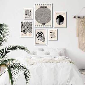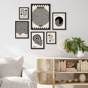 Composição 6 quadros bauhaus preto e branco Moldura: madeira preta Informações do produto tire todas as suas dúvidas no descritivo abaixo: decoração para quarto, sala, cozinha, escritório, área gourmet e muito mais. Chega de paredes vazias medidas - kit composto por 6 quadros, sendo 2 quadros com medida 18x24cm, 3 quadros com 24x33cm e 1 quadro com medida 33x45cm. Material do papel - papel fotográfico brilhante de altíssima resolução acabamento - todos os quadros são acompanhados de uma película de acetato para proteção da imagem. - os quadros são embalados de forma segura com plástico bolha com camada dupla de acordo com o tamanho dos quadros. Garantia - garantia de 3 meses. Meu quadro chegou. Como posso fixá-lo Você precisa apenas de um martelo e um prego, pois os quadros já vão acompanhados de penduradores. Esta é a forma mais indicada. Caso prefira, você pode utilizar uma fita dupla face neste caso, sugerimos de alta qualidade para evitar que descole e seu quadro caia . Como posso limpar meu quadro A limpeza é feita como um móvel comum da sua casa. Apenas um pano seco ou espanador são suficientes para tal