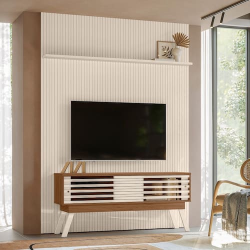Características: Estrutura em MDP Pintura semi brilho Portas deslizantes frisadas Pés Retrô Painel com detalhes frisados (baixo relevo) Espaço para TV até 65 Polegadas.