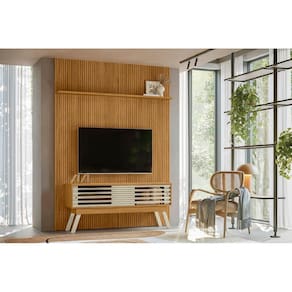 A Composição Frizz New Premium combina estilo moderno e praticidade, sendo fabricada com estrutura em MDP e MDF de 12, 15 e 25mm, revestida com pintura UV de alta qualidade, que proporciona resistência e elegância. Suas dimensões incluem um rack de 1,500 x 0,675 x 0,390m e um painel de 1,790 x 2,445 x 0,185m, ambos projetados para acomodar TVs de até 65 polegadas, com entradas específicas de 1,500 x 0,385m no rack e 1,790 x 1,200m no painel. O painel apresenta um sofisticado frisado em MDF com design em baixo relevo, enquanto o rack conta com duas portas deslizantes frisadas que se sobrepõem, duas prateleiras e puxadores funcionais que garantem organização e praticidade. Os pés retrô adicionam um toque de charme ao conjunto, conferindo estabilidade e um design atraente. O sistema de montagem Girofix facilita a instalação, tornando a Composição Milo uma escolha inteligente para quem deseja um ambiente moderno, funcional e elegante.