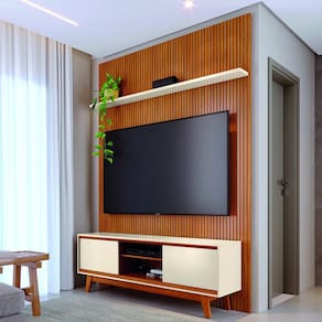 Características: Estrutura em MDP Pintura semi brilho Painel em MDF frisado (baixo relevo) Portas Deslizantes Detalhe chanfrado na base e no tampo Pés Usinados Espaço para TV até 65 Polegadas.